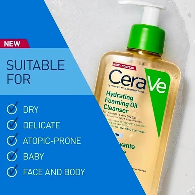 CeraVe Hydrating Foaming Oil Cleanser gently cleanses while providing nourishing comfort that leaves skin on the face and body looking healthy and feeling refreshed. Suitable for normal to very dry skin. Also suitable for sensitive and atopic prone skin. Unique foaming oil daily cleanser to efficiently cleanse, while providing a nourishing comfort that leaves face and body skin looking healthy. Filled with hydration boosting ingredients; 3 Essential Ceramides, Glycerin, Hyaluronic Acid, Squalane and Triglyceride, this cleanser removes dirt while maintaining the skin’s protective barrier. Developed with dermatologists, CeraVe Hydrating Foaming Oil Cleanser is suitable for normal to very dry skin. Also suitable for sensitive skin, baby skin and atopic prone skin. Non-comedogenic. Fragrance free. Gynecologist tested. No greasy residue. Containing 3 essential ceramides 1, 3, 6-II, this cleanser formula helps maintain the skin’s natural barrier, ensuring skin does not feel tight. Keeps skin hydrated for up to 24 hours. For Face and Body. For your daily body routine or when you feel like your skin needs a hydration boost, begin with CeraVe Hydrating Foaming Oil Cleanser. Follow up with CeraVe’s Moisturising Cream formulated with 3 essential ceramides and hyaluronic acid to protect the skin’s natural barrier and maintain hydration.
