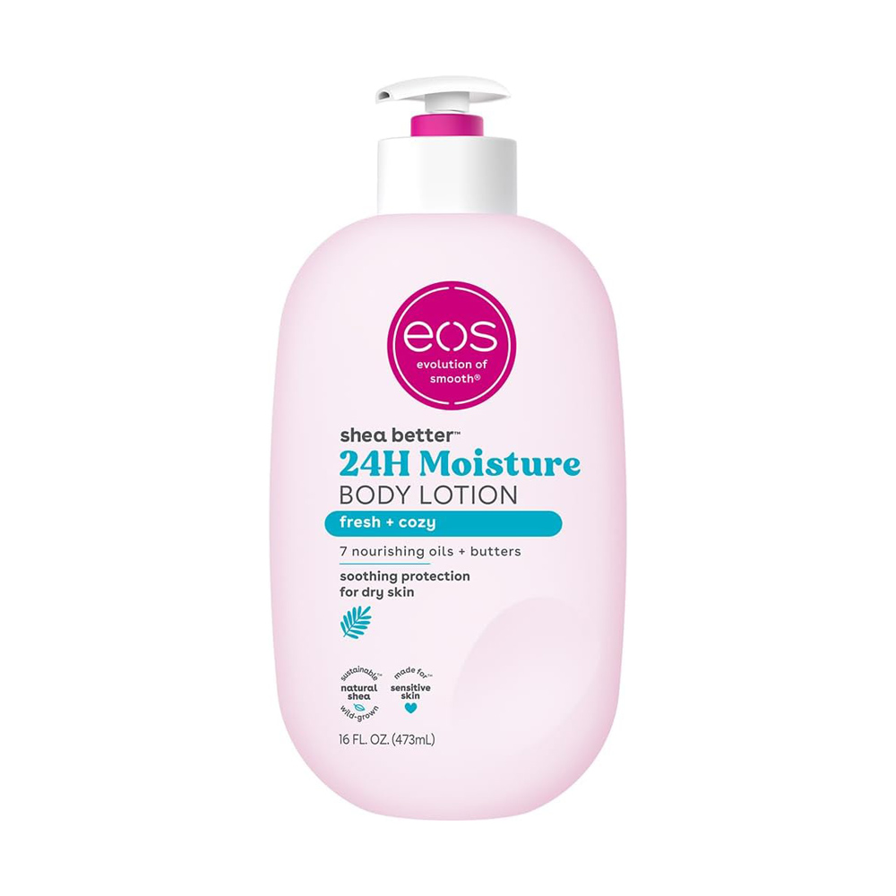 Our Fresh & Cozy shea butter lotion for women feels like what dreams are made of. Scents of morning light, dewy cassis and sheer musk create the ultimate self-care fragrance among scented lotions. eos 24 hour moisture body lotion with instantly moisturizing Shea Oil + lasting protection Shea Butter quickly absorbs for 24-hour hydration. Say hello to fast-absorption, lightweight, soft skin, and sustainable shea. Say goodbye to body skin care products with greasiness, heaviness, and sticky residue. Enjoy the soothing benefits of this moisturizing lotion, exquisitely designed for lightweight, non-greasy, fast-absorbing application.