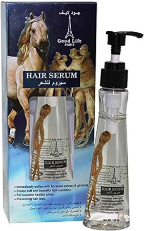 Good life crystal ginseng hair serum/ this hair serum with ginseng extract, has been specially developed with a new formula for dry, brittle and damaged hair ends. Specially promotes hair to grow healthy longer and strengthens weak hair roots and scalp with soft silky touch. To create soft and beautiful hair condition your dry damaged hair with split-end to healthy, soft and shiny hair.