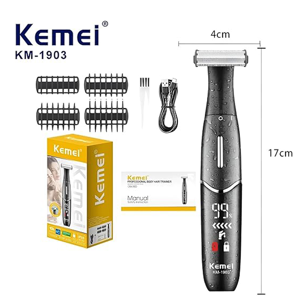 Get the ultimate shaving experience with the KM-1903 Professional trimmer designed to shave hair and body with ease and precision, featuring skin-safe floating double blades that let you shave smooth without irritation, along with a modern LCD display that shows the status of the device. It is equipped with a powerful 600mAh battery that allows you to use up to 60 minutes after a 2.5-hour charge, and the ability to charge using the usual USB cable of any phone makes it ideal for travel. The powerful 6000 RPM motor ensures high quality performance, and the IPX5 waterproof design gives you flexibility to use even in wet conditions. The box contains 4 limit combs, a cleaning brush, a charging cable, and a manual. With the 3 second travel smart lock, you can safely carry it anywhere. Perfect choice for every man looking for a stylish look and a complete shaving experience.
