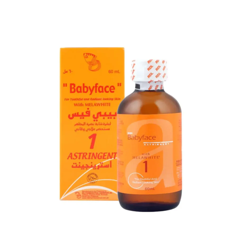 Rdl Babyface Astringent With Melawhite #1. Net. Wt. 60 Ml. Direction For Use: Moisten A Piece Of Cotton With Rdl Babyface Astringent With Melawhite. Gently Apply On Face And Neck Areas. Warning And Precautions: Contains Menthol. Not To Be Used For Children Under 3 Years Of Age. About Product: Avoid exposure to sunlight when using the product. For the best and safest results, use RDL sunscreen during the day for sun protection and RDL whitening cream for the night to moisturize your skin. How to use: Wet a piece of cotton RDL Babyface Solution No. 1 and gently apply to face and neck. Don’t rub. Use once or twice a day.