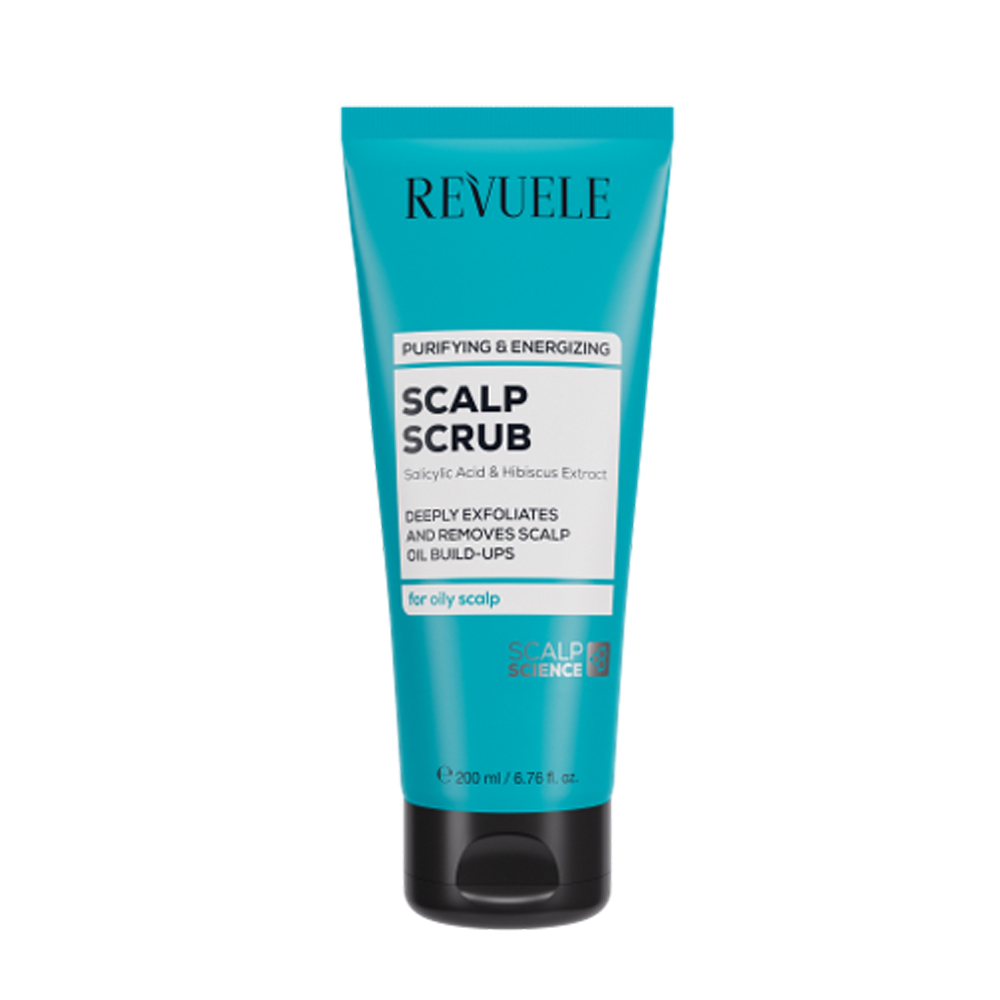 REVUELE SCALP SCRUB PURIFYING & ENERGIZING. Deeply exfoliates the scalp skin to remove excess sebum and product build-up. By massaging the scrub, micro-circulation is activated, helping to promote skin renewal for optimal scalp health. Powered by potent mix of active ingredients, it effectively purifies and revitalizes the scalp. The formula helps combat excess oil production and dandruff, revealing shinier, more voluminous hair. The gel texture with Salicylic Acid and delicate scrub particles is specifically designed to intensively exfoliate the scalp and clean hair but is gentle enough to be used frequently. It is suitable for oily scalp.